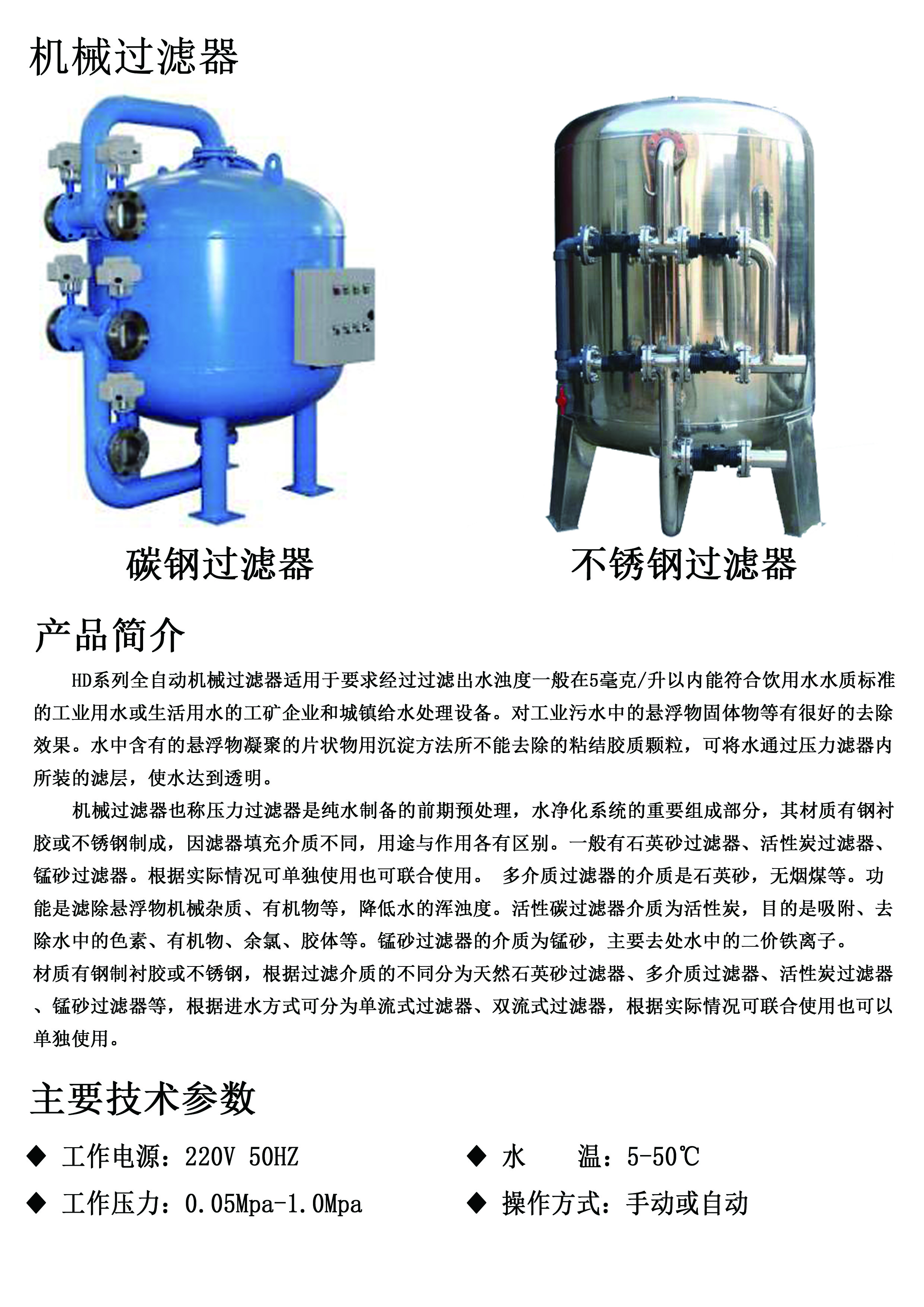 機械過濾器是利用一種或幾種過濾介質,在一定的壓力下,使原液通過該介質,去除雜質,從而達到過濾的目的。其內裝的填料一般為:石英砂、無煙煤、顆粒多孔陶瓷、錳砂等,用戶可根據(jù)實際情況選擇使用。
